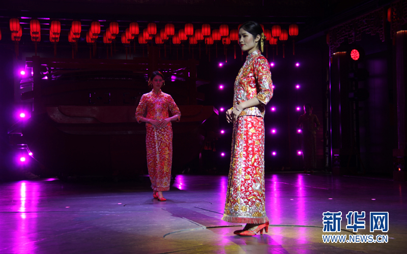珠江红船内,展出了岭南婚庆中的传统嫁衣。新华网发(郎美智摄)