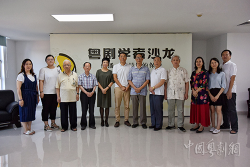 专家评委们与工作人员在粤剧学者沙龙背景墙前面合影