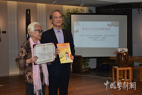 从化区街口街粤剧文化协会荣誉会长姚冠冰《情系小红豆,爱满粤韵园》讲座。85岁的“冰婆婆”讲述当年创建小红豆校外辅导站,开展粤剧进校园,持之以恒克服困难推广粤剧文化,培育粤剧新苗,与星海音乐学院师生分享传承粤剧文化、“爱心桥”解困助学的心路历程。星海音乐学院图书馆馆长温带宝致词中提到,“冰婆婆”对粤剧文化推广和扶困助学的坚持努力,在社会上有一定影响力,“学习强国”网站于今年7月对姚冠冰的事迹作专题报道,高度评价她对粤剧文化传承的无私奉献,随后为“冰婆婆”颁发荣誉证书,对她多年来推广粤剧进校园培育粤剧新苗工作致意。